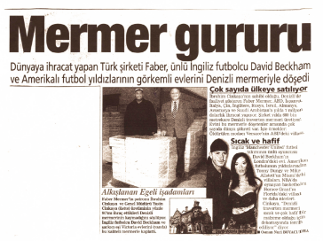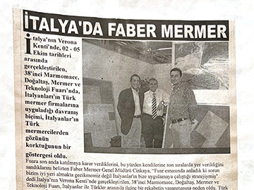 Faber Mermer A.Ş., 2003 yılında Pekin’de düzenlenen Stonetech Fuarı’na katılarak Denizli’yi temsil eden tek Türk firması olmuştur. Türkiye genelinden yaklaşık 300 firmanın katıldığı organizasyonda Faber Mermer, ürün kalitesi ve stand sunumuyla dikkatleri üzerine çekmiştir.