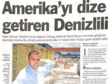 Cinkaya Group Yönetim Kurulu Başkanı Yasin Cinkaya, 5 yıl önce taş ocaklarında çalışırken, şimdi ABD'de bir mermer devi oldu. Cinkaya, Los Angeles, Las Vegas ve San Francisco gibi şehirlerde yıllık 12 milyon dolar ihracat yaparak Denizli'yi globalde temsil ediyor. Cinkaya, ünlüler (Pierce Brosnan, Alma Mudar) ve lüks villalar tarafından tercih edilen Faber Mermer ürünleriyle dikkat çekiyor. Firma, California'daki eyalet binalarında, ünlü Stone Sirkesi'nin sahiplerinde ve Türkiye'den ABD'ye mermer ihracatı yapan diğer projelerde yer alıyor.